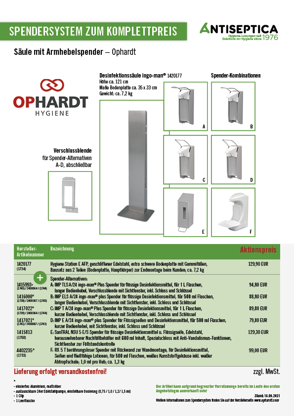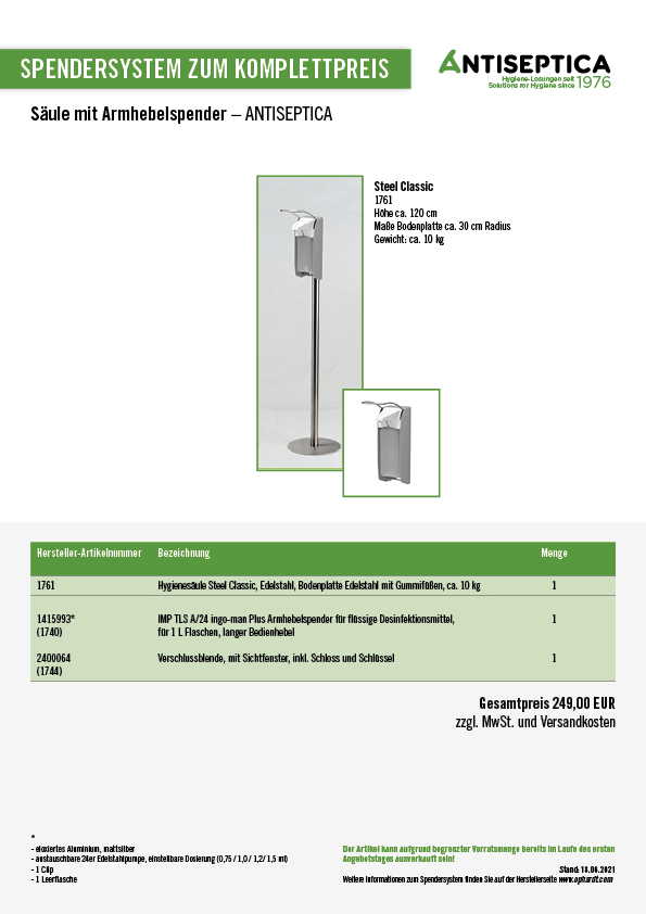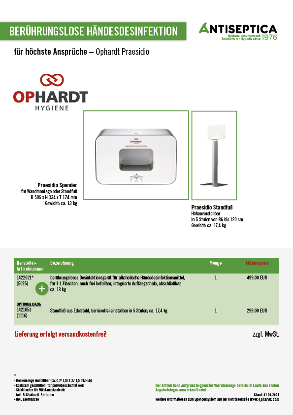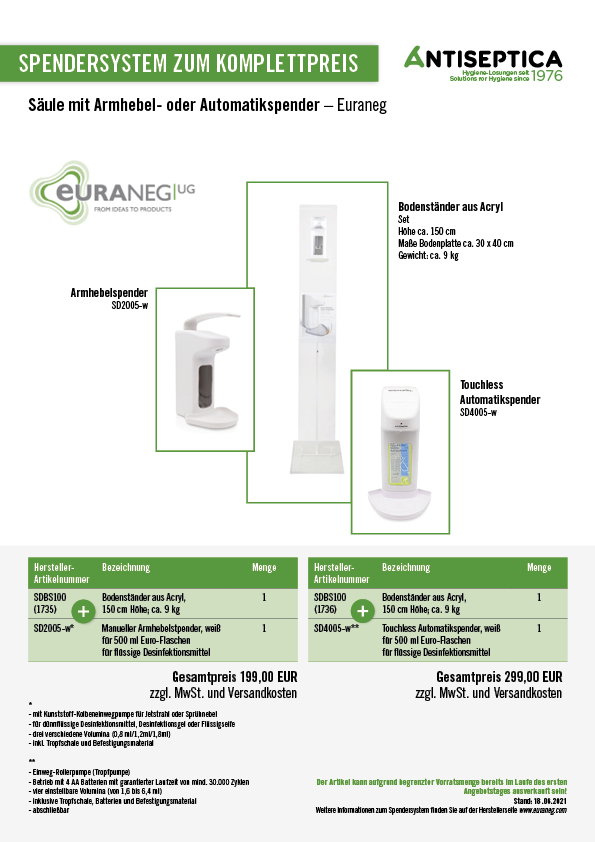 Aufgrund der andauernden Coronavirus-Situation haben wir temporär unser Angebot um Desinfektionsmittelspender sowie Spendersäulen diverser Hersteller erweitert.